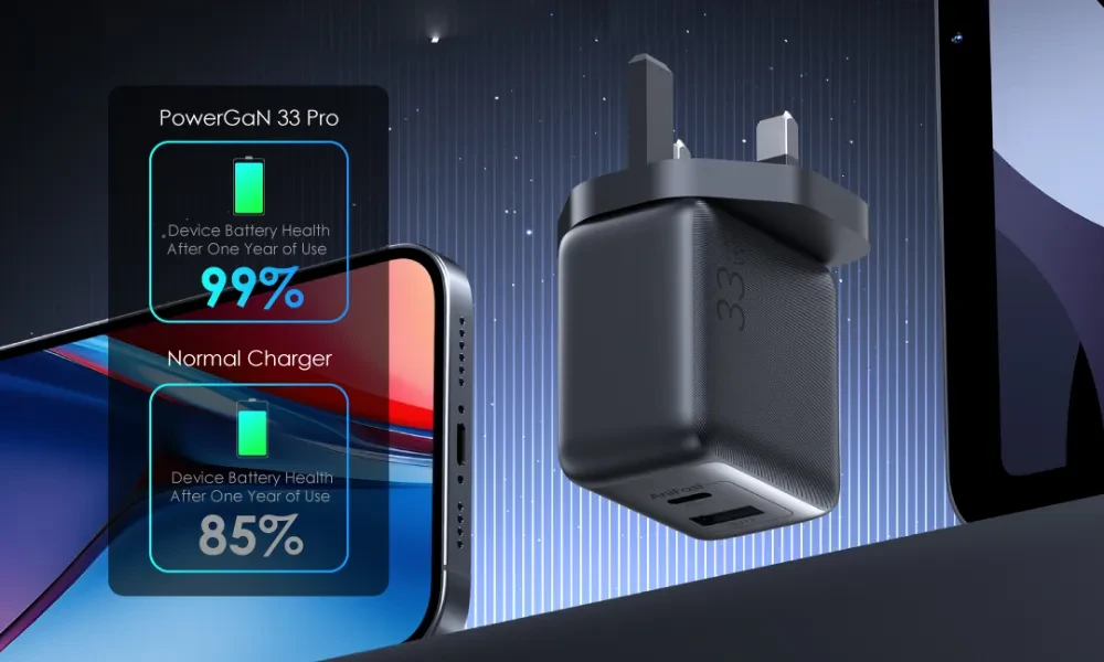 کاربرد فناوری GaN نه تنها توان شارژ سریع 33 وات را ممکن ساخته، بلکه سبب میشود گرمای کمتری در هنگام شارژ تولید شود و شارژر بتواند برای مدت طولانی تر بدون افت عملکرد کار کند. این مزیت فنی به ویژه در محیط های گرم یا زمانی که چندین دستگاه را همزمان شارژ میکنید، اهمیت زیادی دارد.
